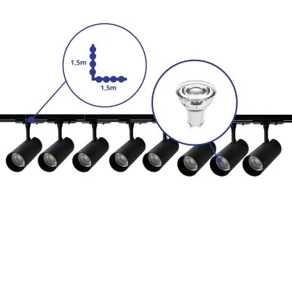 Komplettset 1-Phasen Rail L 1,5 x 1,5 Meter Schwarz | incl. 8x Spot + GU10 2700K 3W Dimmbar + Abschlusskappe, Stromanschluss und L -Verbinder